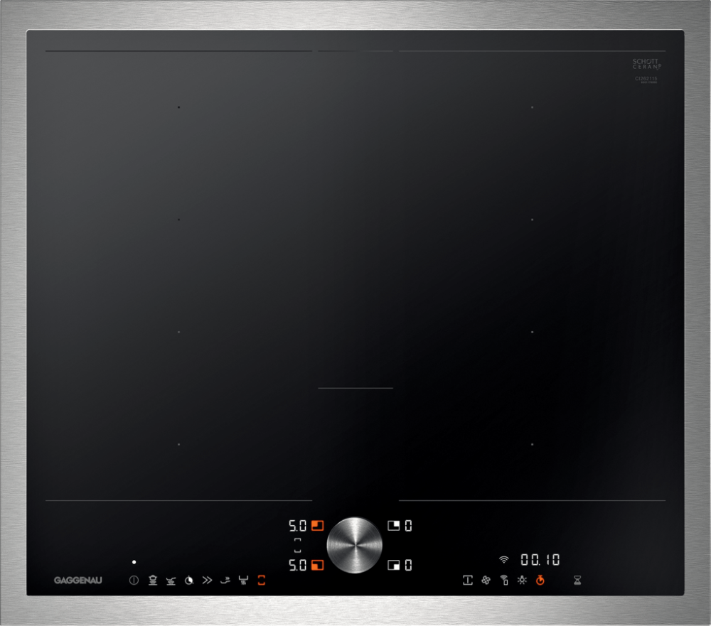 Индукционная варочная поверхность Gaggenau CI262 - это незаменимый прибор на любой кухне! Эта модель имеет 4 конфорки общей номинальной мощностью 7400 Вт. При этом 2 пары конфорок могут быть объединены в большую зону. В целях безопасности варочная панель имеет защиту от детей, автоотключение при перегреве, защиту при выкипании и индикаторы остаточного тепла.  При желании этот прибор можно установить заподлицо вровень со столешницей.