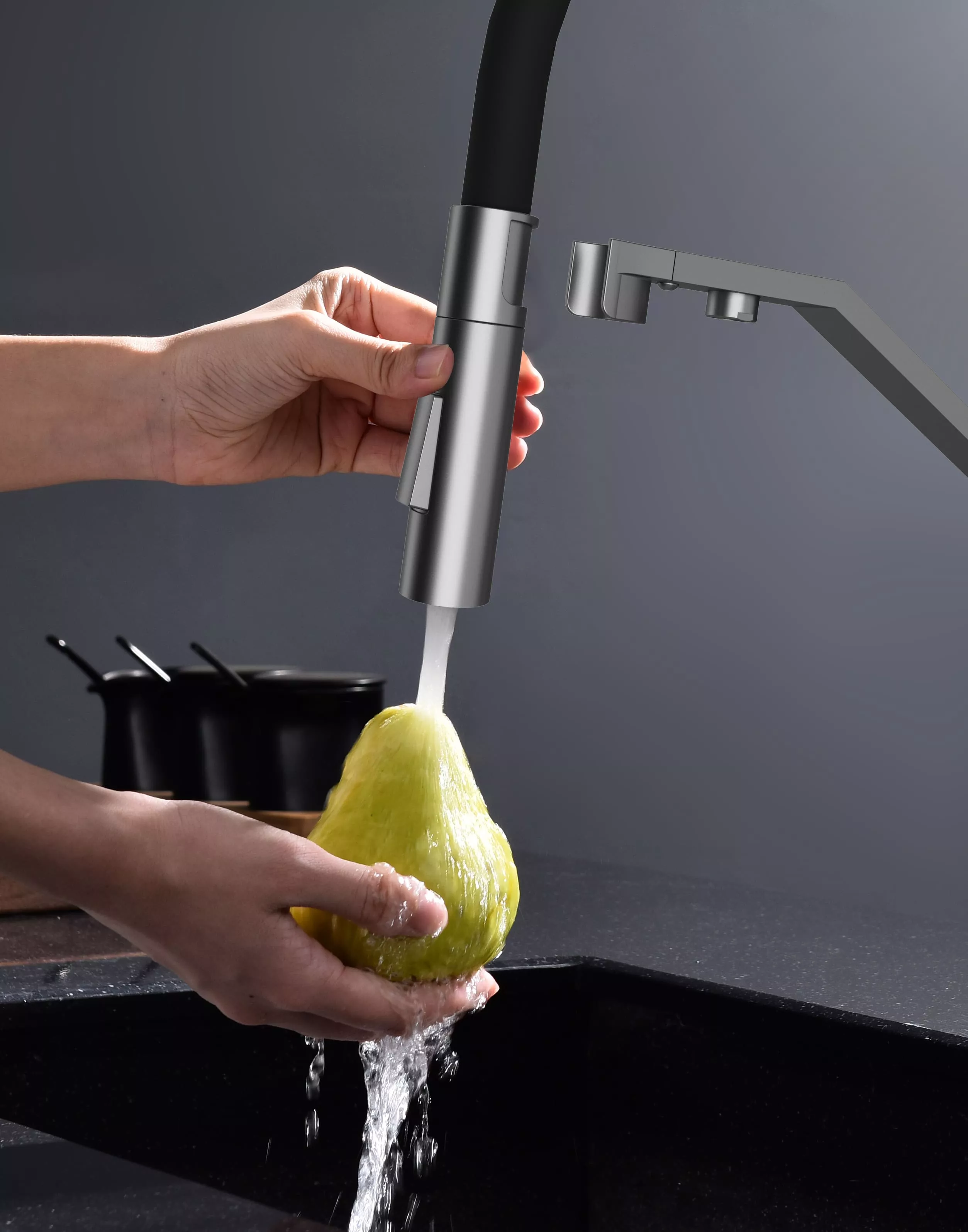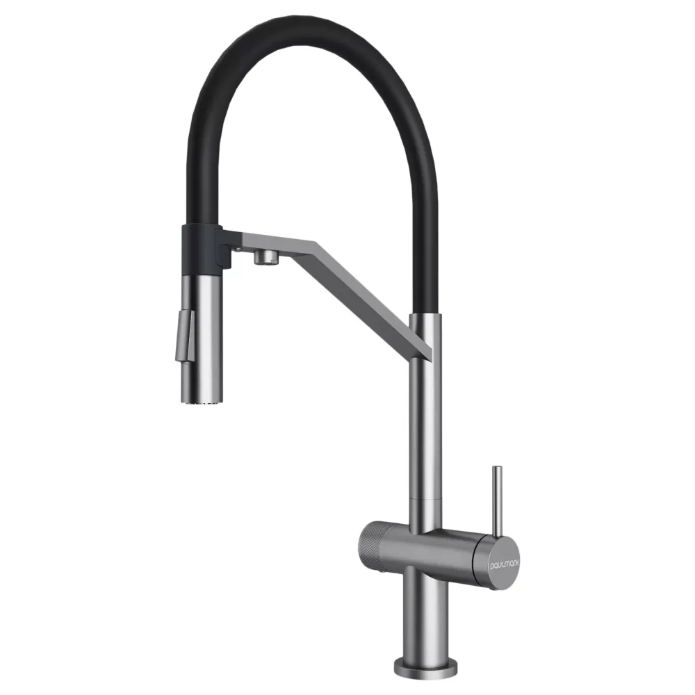 Многофункциональный смеситель для кухни ZENDER оснащен функциями подключения фильтра питьевой воды и гибким силиконовым изливом с двумя режимами подачи водопроводной воды: струя и душ. Для переключения между этими режимами предусмотрена удобная кнопка на конце излива. Управление подачей очищенной питьевой воды осуществляется поворотом специальной ручки, расположенной слева и имеющей декоративные лазерные насечки, при этом вода подается через отдельный аэратор.